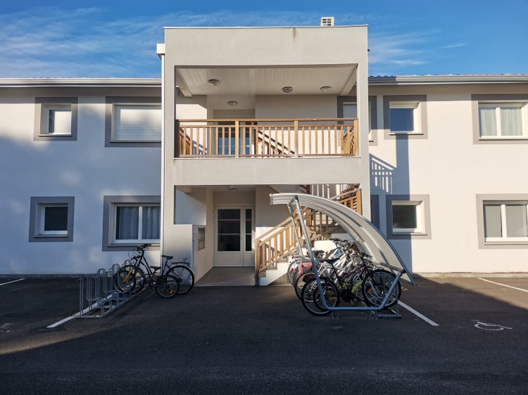 La résidence Hortensias est située dans la commune de Soustons, à l’entrée du centre-ville. Elle est composée de 8 logements : 6 T3 et 2 T2. La circulation verticale est extérieure. Les escaliers sont positionnés en façade Est, directement en lien avec le parking et le garage à vélos. Cette résidence blanche et grise propose un espace extérieur à chaque logement. En RDC il s’agit de petites parcelles de jardin et en R+1 de grandes terrasses.