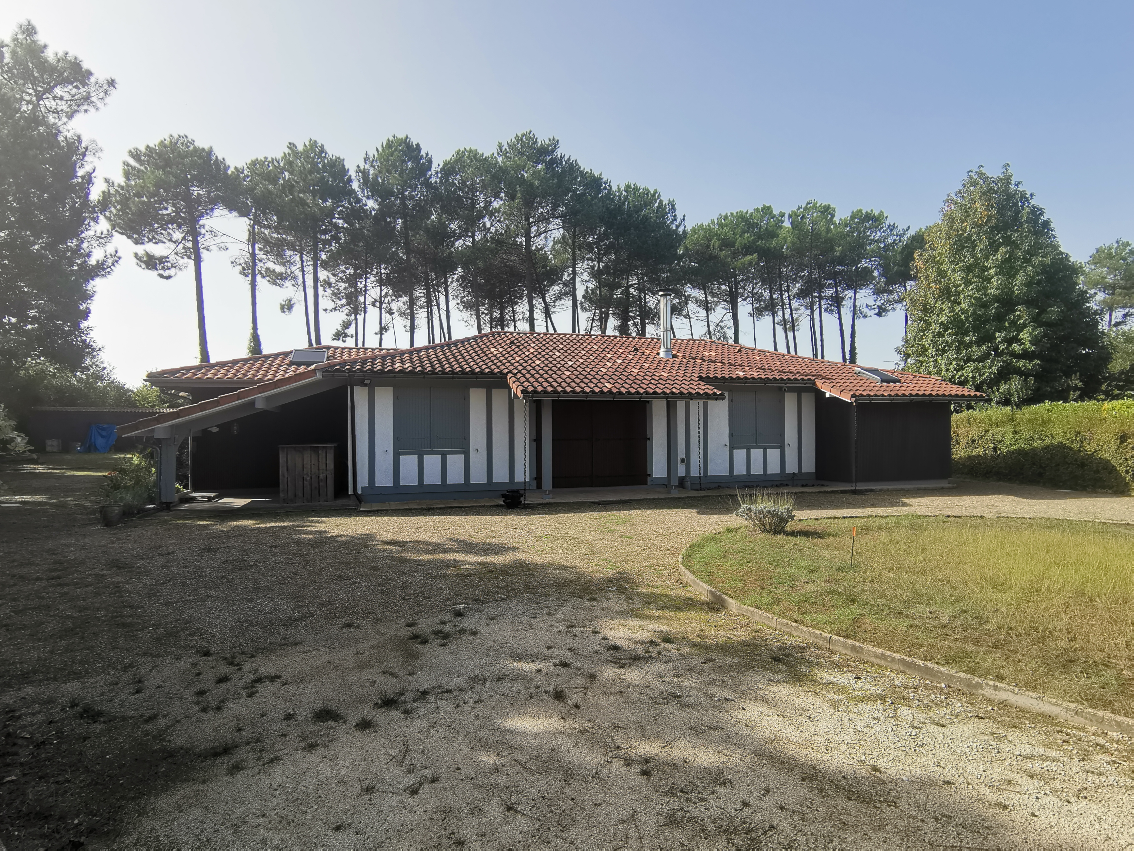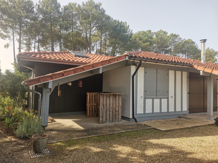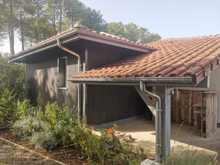 A l’extérieur le projet se veut discret et fondu dans le décor Landais. Un bardage imitation tasseaux de bois, couleur anthracite vient revêtir l’agrandissement ainsi que l’ancien garage. Les toitures sont en tuiles orangées comme l’existant et les pentes reprennent la charpente initiale également.