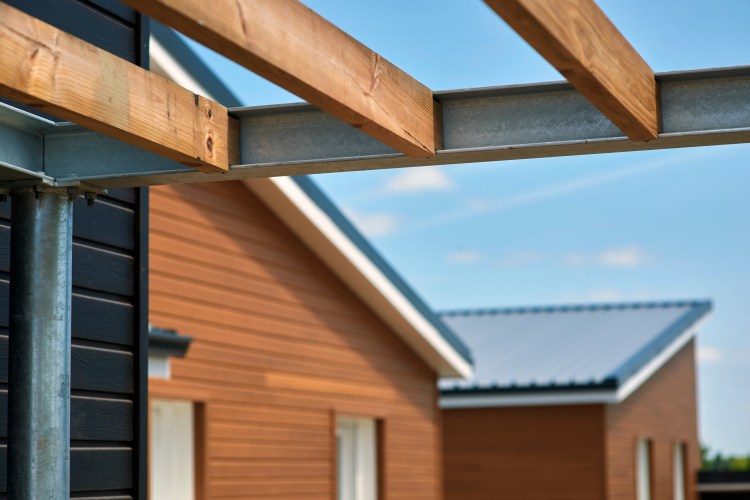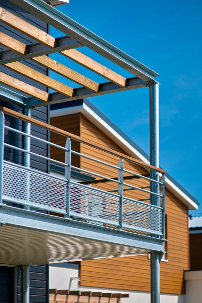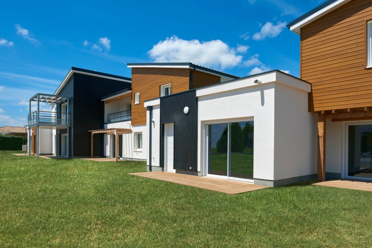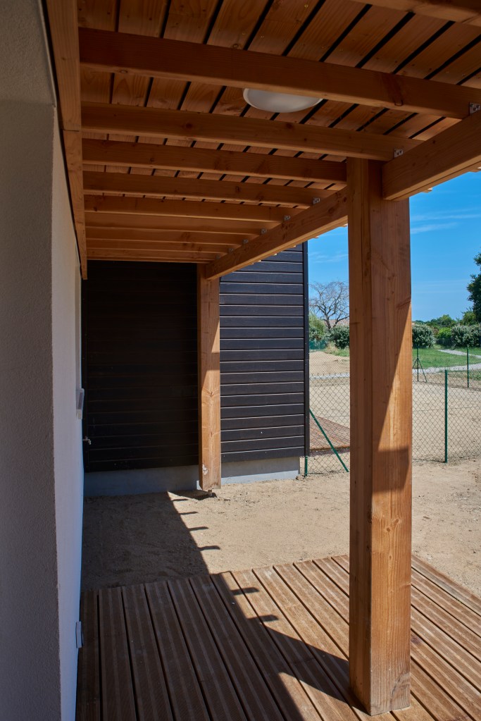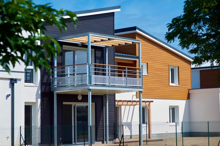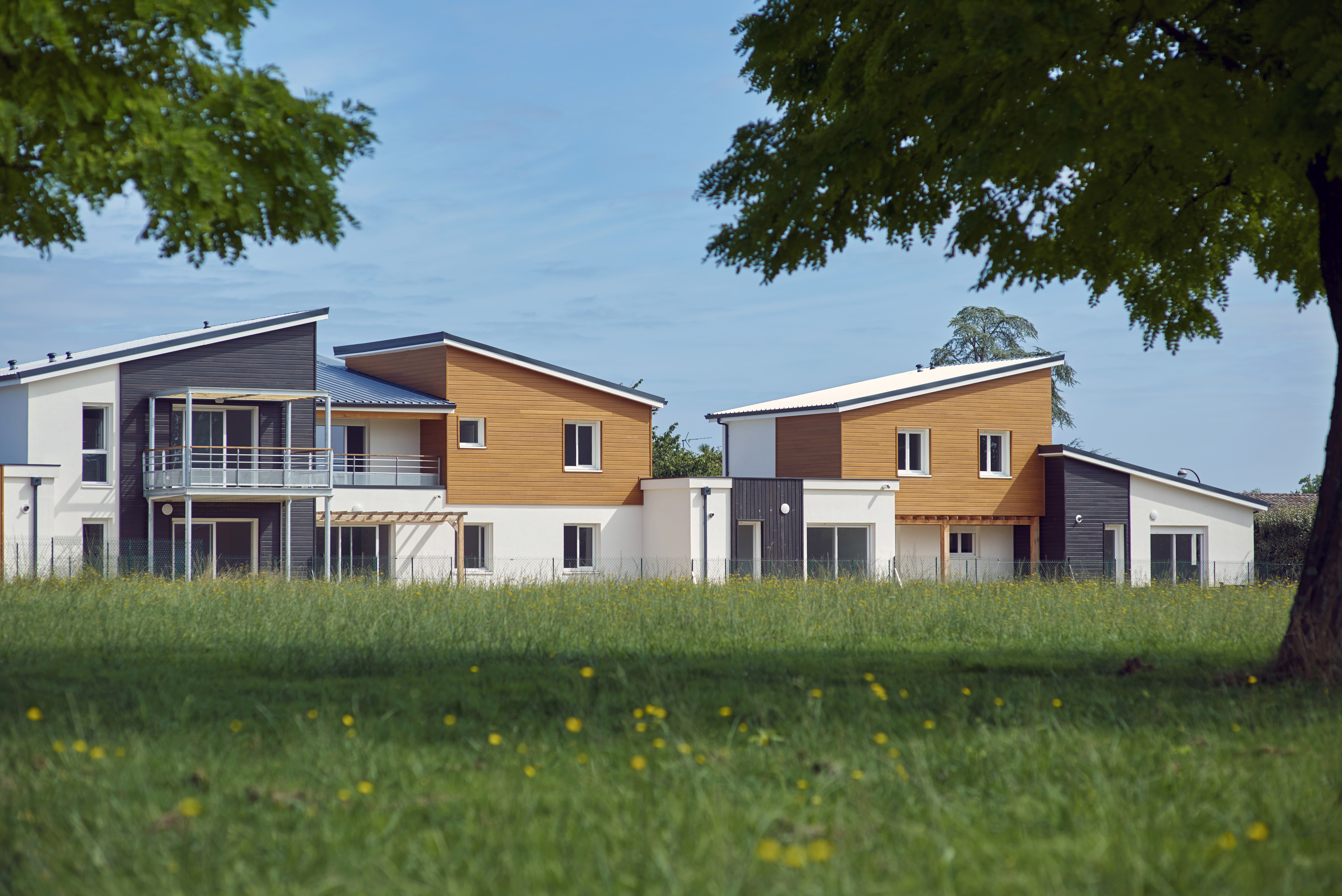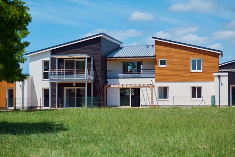 Le terrain se situe dans un quartier pavillonnaire du centre de la commune. Le parti était d’intégrer notre bâtiment dans son environnement avec la conception de trois bâtiments identiques en R+1 partiel dont l’implantation, l’orientation et l’esthétique évoquent de petites maisons de ville accolées. Le programme se compose de 3 bâtiments divisés en 24 logements : 6 T2, 12 T3, 3 T4 et 3 T4 duplex. La structure et le plancher intermédiaire sont en bois, ce qui permet un montage du clos/couvert en un temps record. La distribution des logements se fait depuis l’extérieur avec des escaliers et des coursives métalliques. Le principe de structure métallique est repris en façade sud afin de créer des terrasses avec pergola pour les logements de l’étage tout en protégeant par la même occasion les terrasses du RDC donnant sur les jardins privatifs.